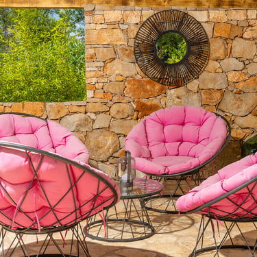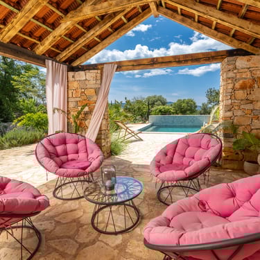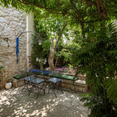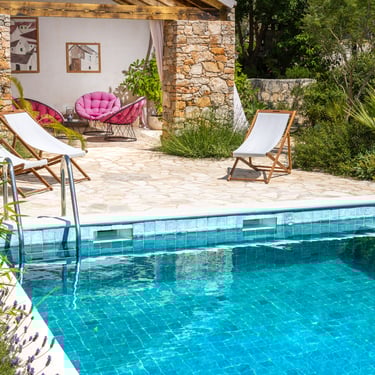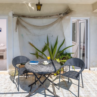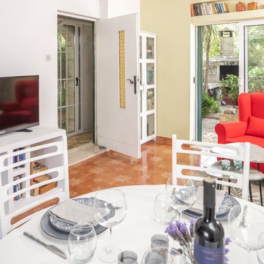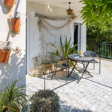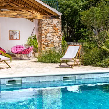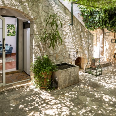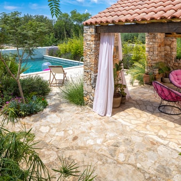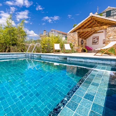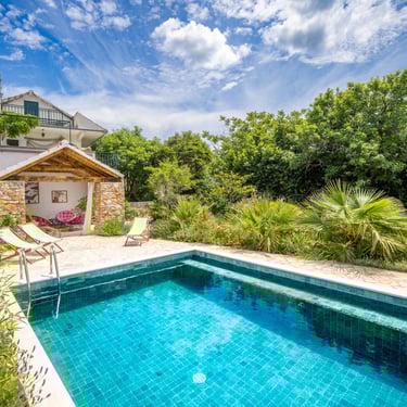 The exterior of the property consists of a terrace, a courtyard with outdoor seating, a pool with the a deck, a large garden and outside fire place / bbq. The interior of the house consists of a kitchen with dining area and living room, a wshroom and one of the bedrooms. An exterior staircase leads up on first floor where there are two bedrooms and a washroom.
